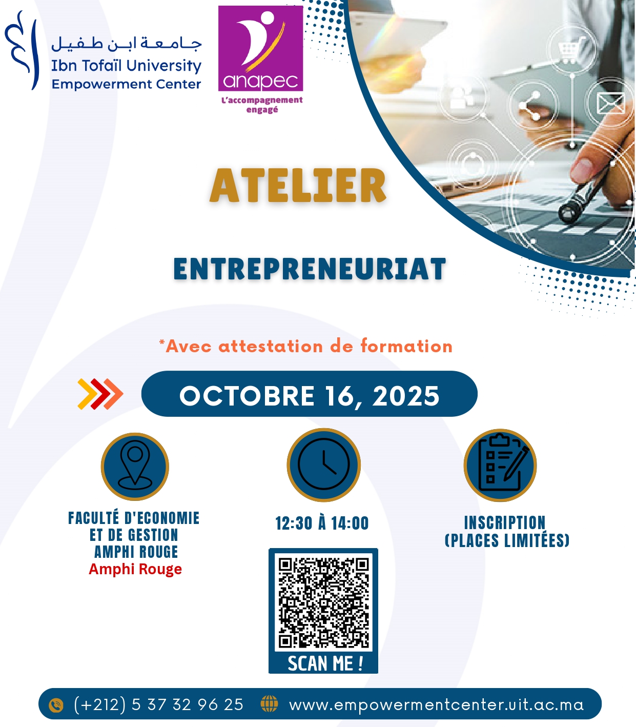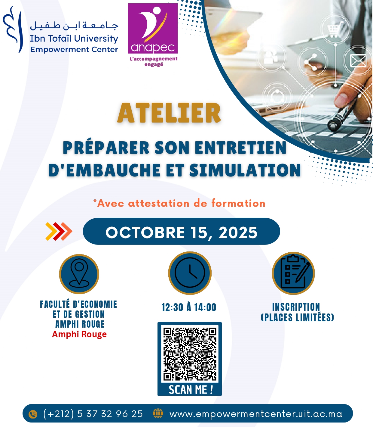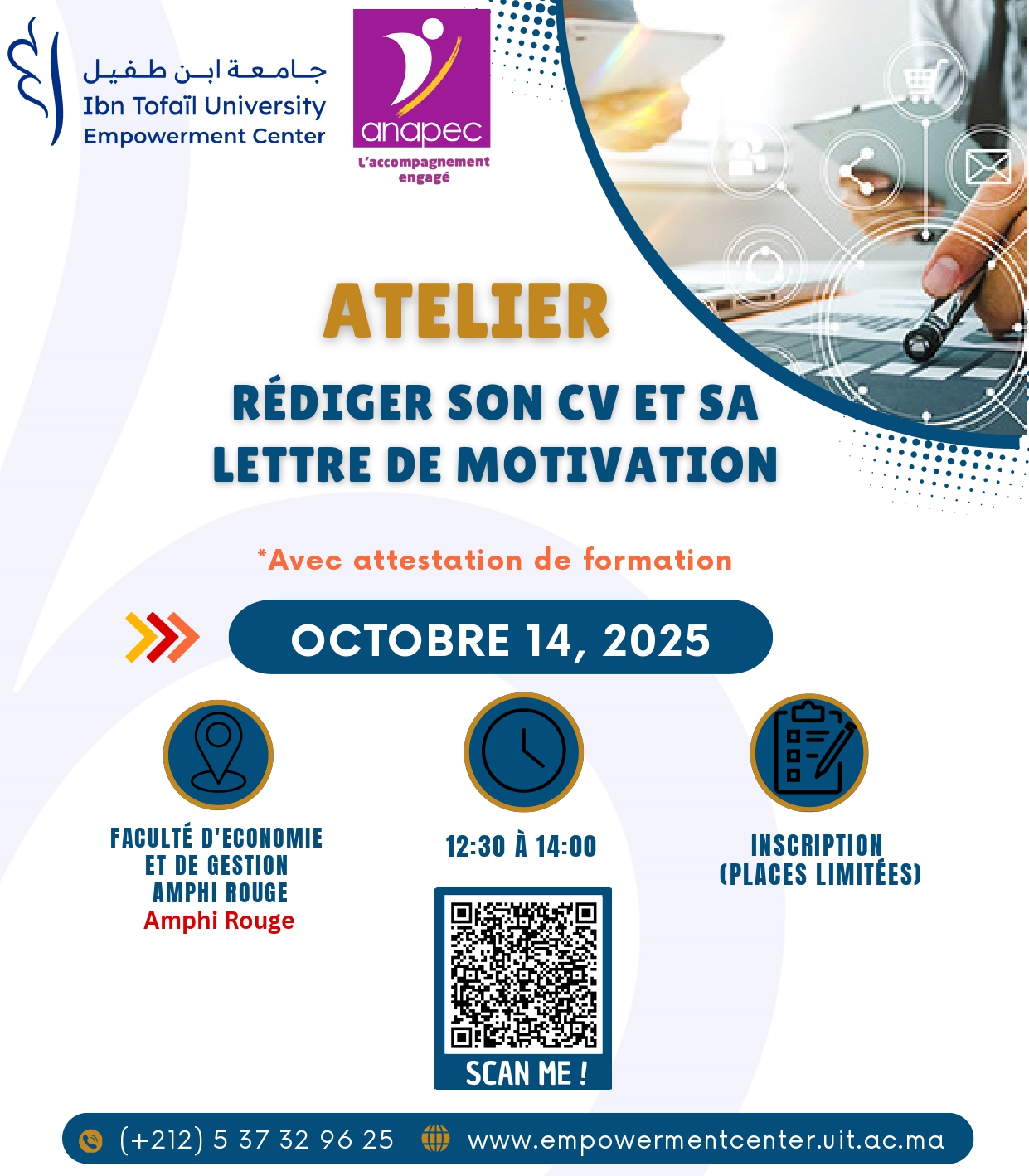 Dans le cadre de sa stratégie d’excellence et d’insertion professionnelle, l’Université Ibn Tofaïl organise, en partenariat avec plusieurs institutions nationales et internationales, une série de formations et workshops dédiés à l’employabilité et à l’entrepreneuriat étudiant. Ces activités, programmées au sein de la Faculté d’Économie et de Gestion du 14 au 28 octobre 2025, visent à doter les étudiants de compétences concrètes en rédaction de CV et lettres de motivation, préparation aux entretiens d’embauche, création d’entreprise et développement coopératif, profil sur linkedin. Des partenaires de renom tels que Dar Al Mokawil et INJAZ Al-Maghrib accompagneront les étudiants dans ce parcours d’apprentissage pratique en faveur de l’employabilité, de l’innovation et du renforcement des liens université-entreprise.